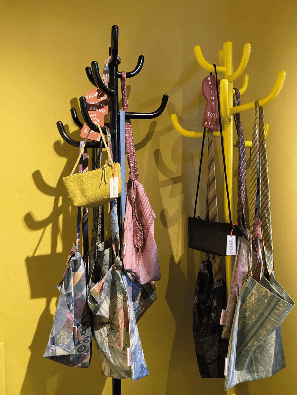 In ons eigen atelier hergebruiken we oude materialen en geven deze een nieuwe bestemming. Zo maken we tassen en kussens van vintage textiel en lampen van preloved keramiek.