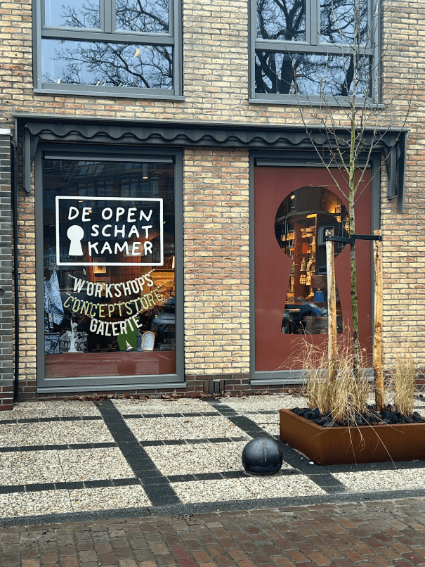 De Open Schatkamer; concept store & atelier met producten op het gebied van upcycling, vintage, kunst en lifestyle. In de winkel draait het om creativiteit; van oude materialen nieuwe dingen maken, maar ook een verrassende selectie van schilderijen, tassen, sieraden en interieuraccessoires. De slogan van de winkel is parels voor parels. Iedereen is uniek en kostbaar. Dat is een speerpunt van het christelijk geloof en dat willen we graag uitdragen. Er zijn pareltjes te vinden in de winkel, maar meer nog zijn mensen parels.